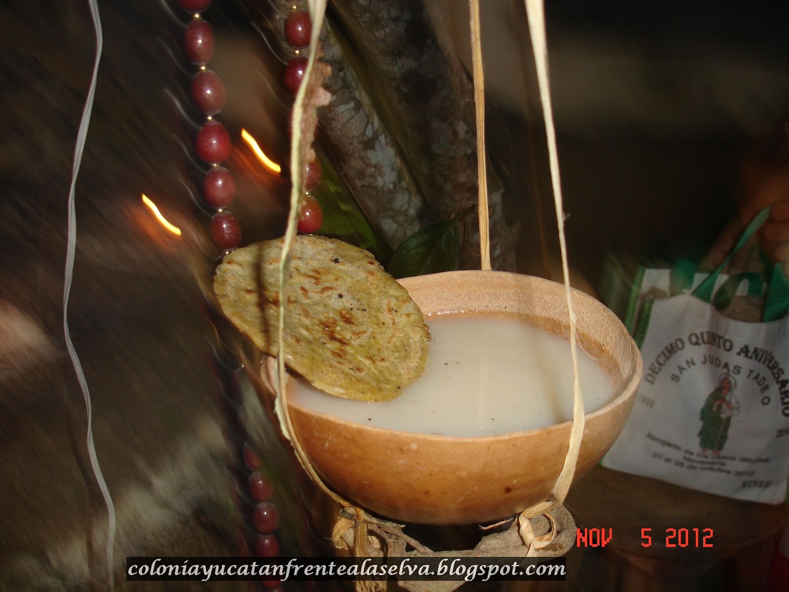“La cruz de los altares recordaba el “Ya’axché” o árbol sagrado; las velas, el camino a seguir por las almas y las ofrendas que varían de significado. De acuerdo con los antiguos rituales las ofrendas se componían de 4 jícaras de atole nuevo colocadas en cada esquina de la mesa y una en el centro cuyo significado son los5 puntos cardinales,  para los mayas el quinto punto cardinal representa el eje central del universo. Se ponían 7 montones de 13 tortillas cada uno y 4 recipientes con carne de pavo o puerco guisados en relleno negro.